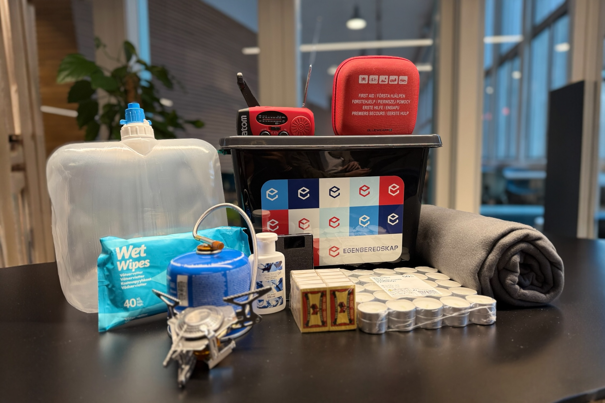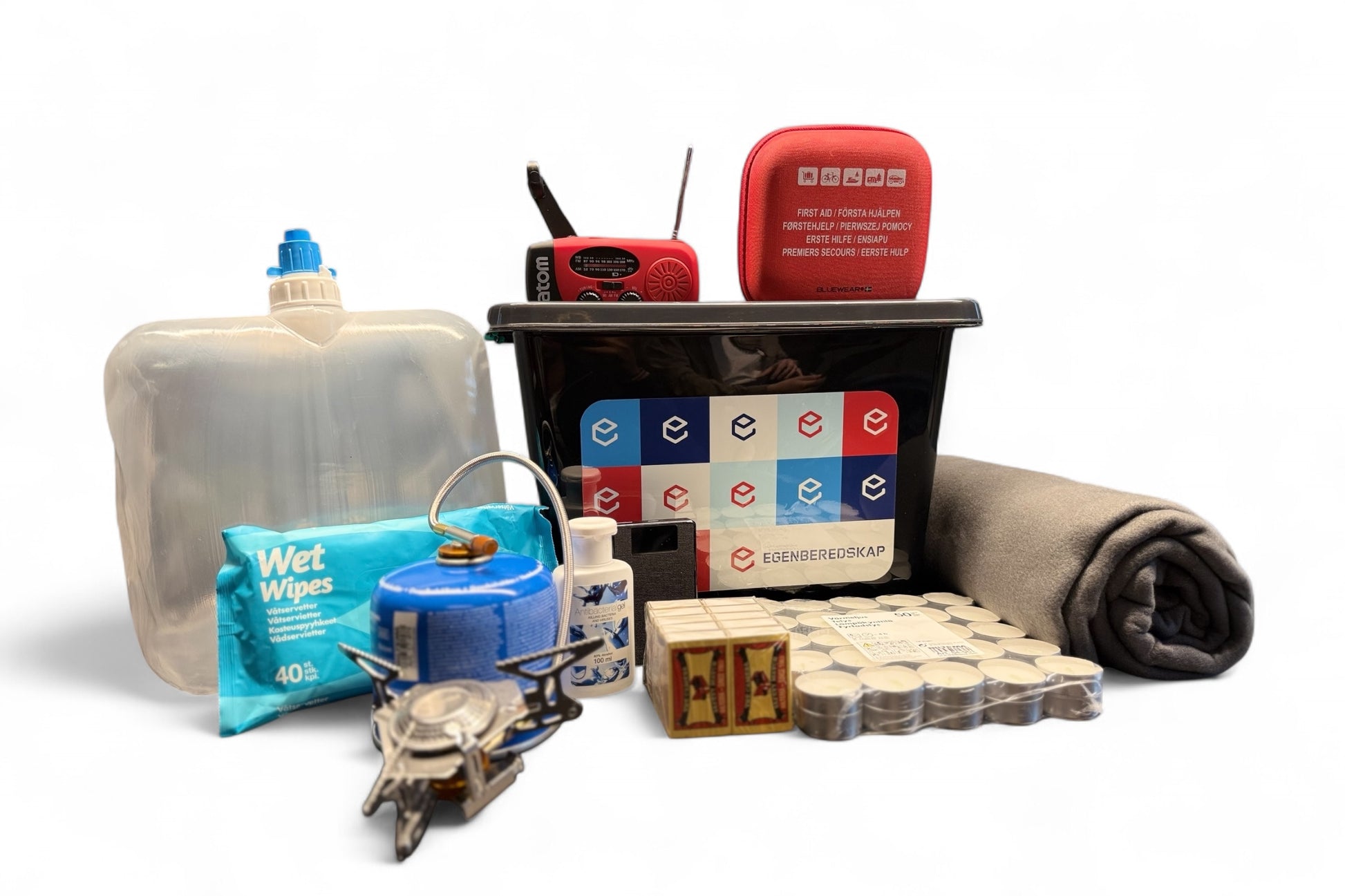 Denne kassen inneholder det du trenger for å dekke grunnleggende behov i minst én uke. Har man flere husstander anbefales det å ha en kasse i hver husstand. Innholdet er tilpasset antall personer.